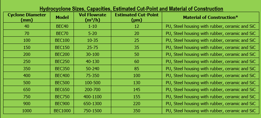 Our simulation program predicts process parameters such as cut point, efficiency factors, operating pressure as well as design parameters such as hydrocyclone diameter, vortex finder size, spigot size, free vortex finder height, Our hydrocyclone range include 40, 70, 100, 150, 200, 250, 350, 400, 500, 600, 700, 800, 900, 1000 mm diameter units with ceramic, silicon carbide, rubber, and polyurethane lining.
